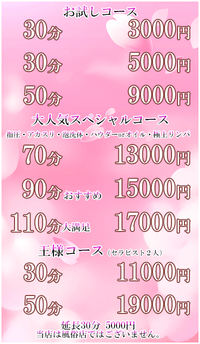 私たちはそんな日々お疲れの貴方様に尽くし、疲れを取り除くべく日々腕に磨きをかけております!!当店自慢のマッサージ技術で是非、気持ち良くなっていただければ幸いでございますそれが私たちの喜びです!