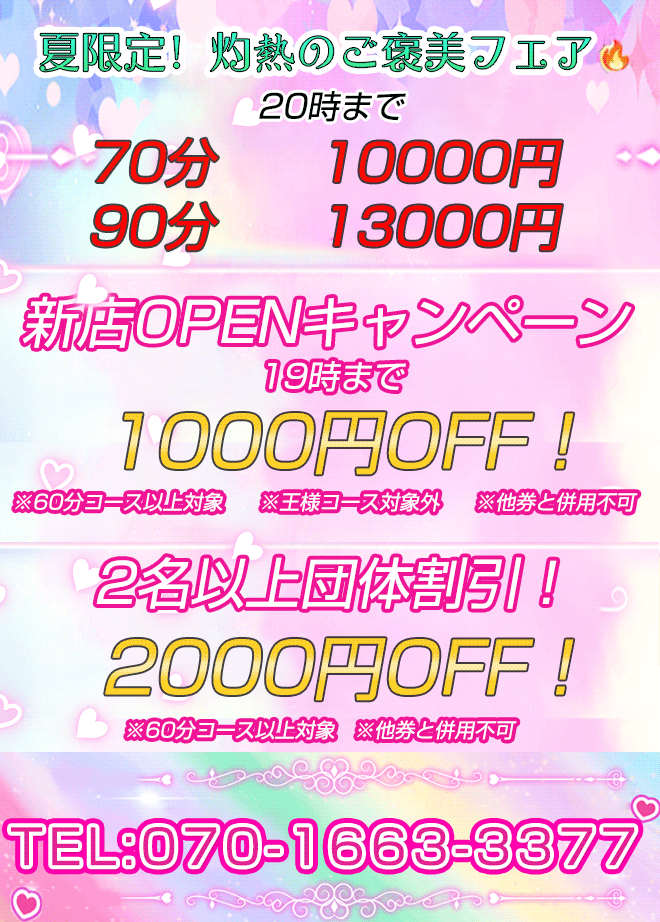 疲れでしたら癒しに来てくださいね。心と身体は一心一体ですがキュートなセラピストと二心二体の癒しを一度味わってみて下さい。心身共に溶ろける感覚を初体験してね!皆様のご来店をお待ちしております